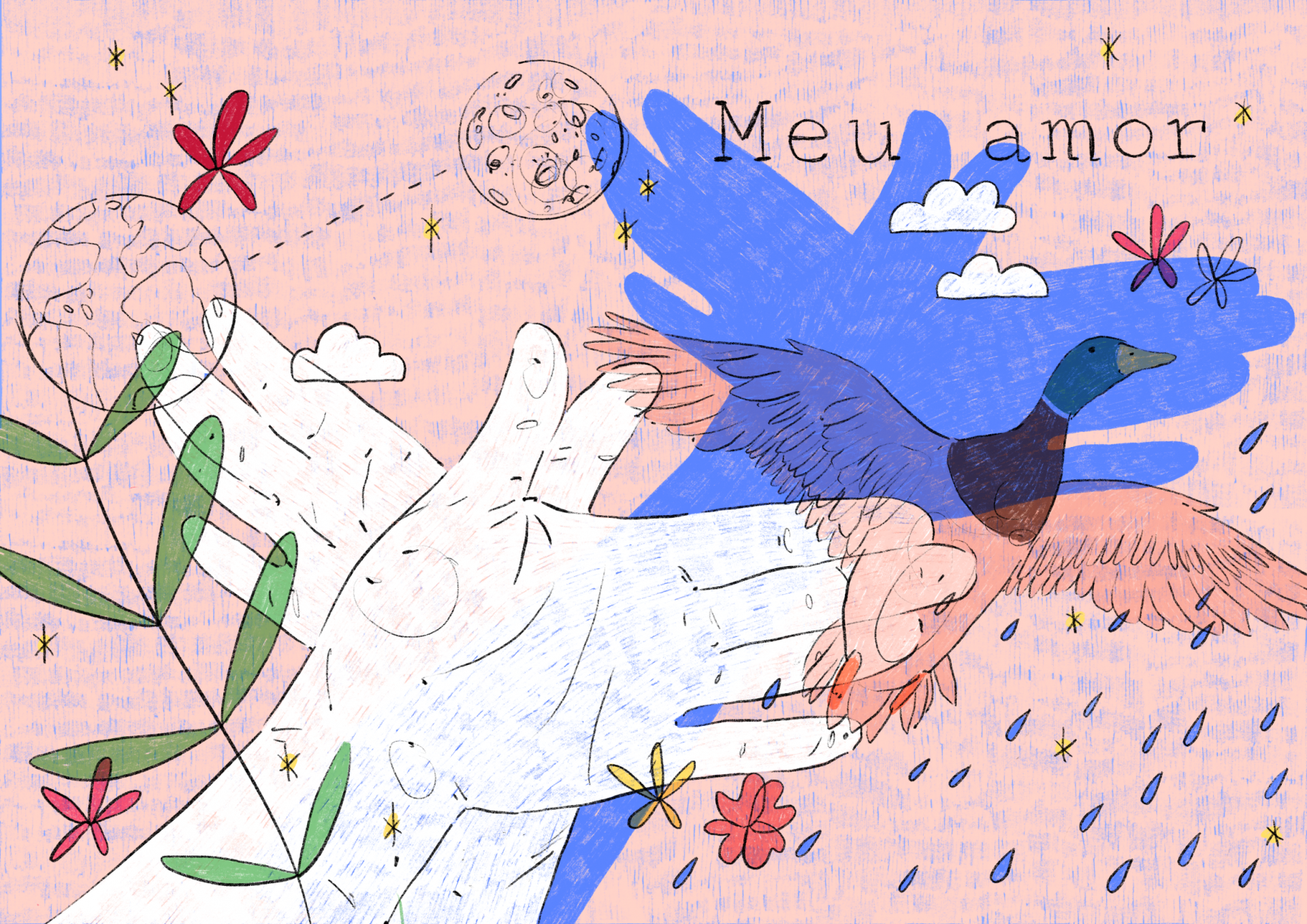 • Ilustração com pato a voar e mãos sobrepostas com texto 'Meu amor'