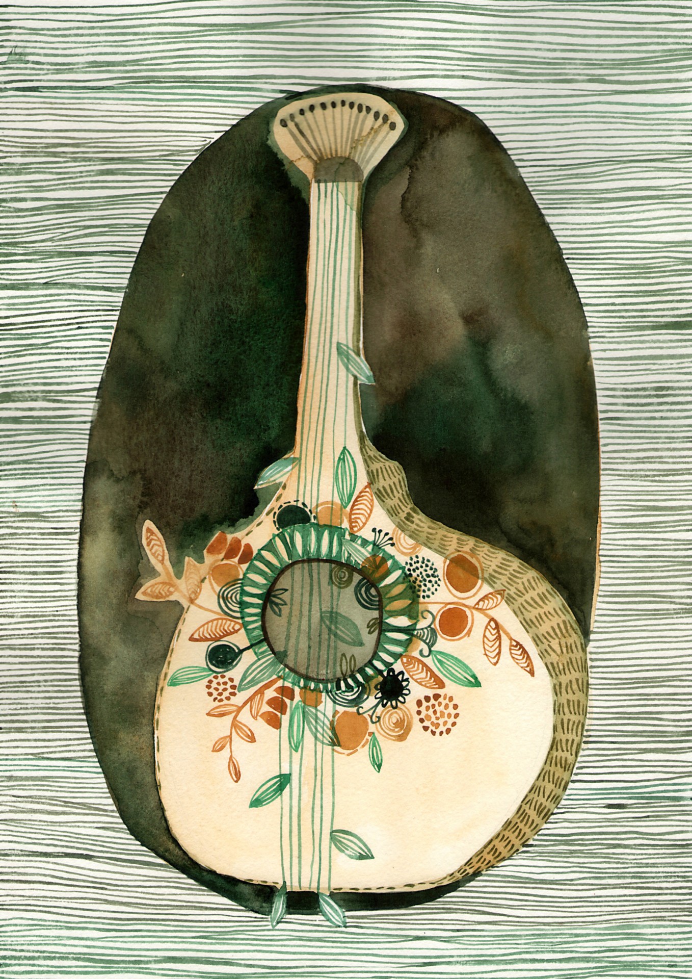 Ilustração de bandolim decorado com elementos florais, fundo listrado em tons verde e sombra escura