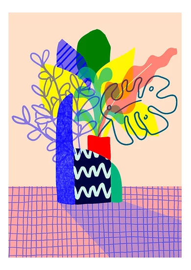 • Ilustração colorida abstrata de vaso com folhas diferentes e padrão ondulado