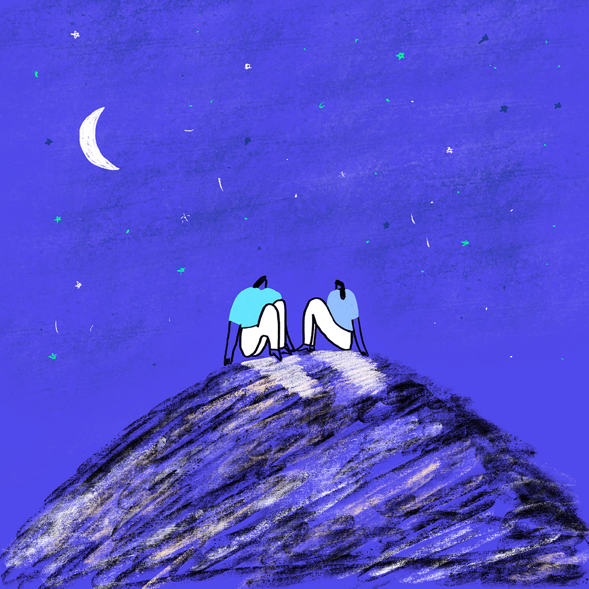 • Duas pessoas sentadas numa colina sob céu estrelado com lua crescente