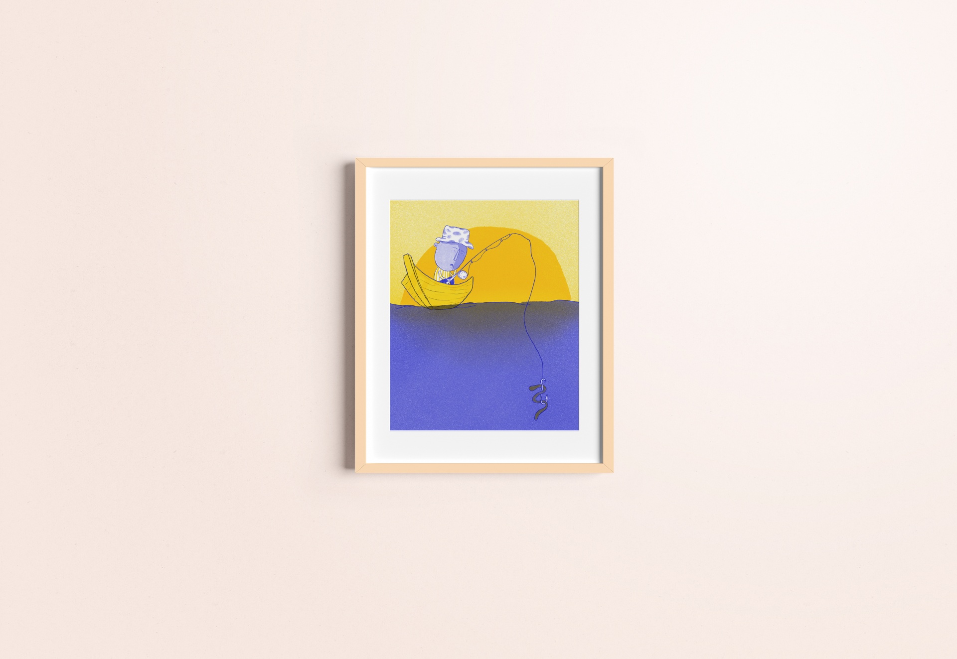 • Moldura de madeira com ilustração colorida de uma pessoa a pescar