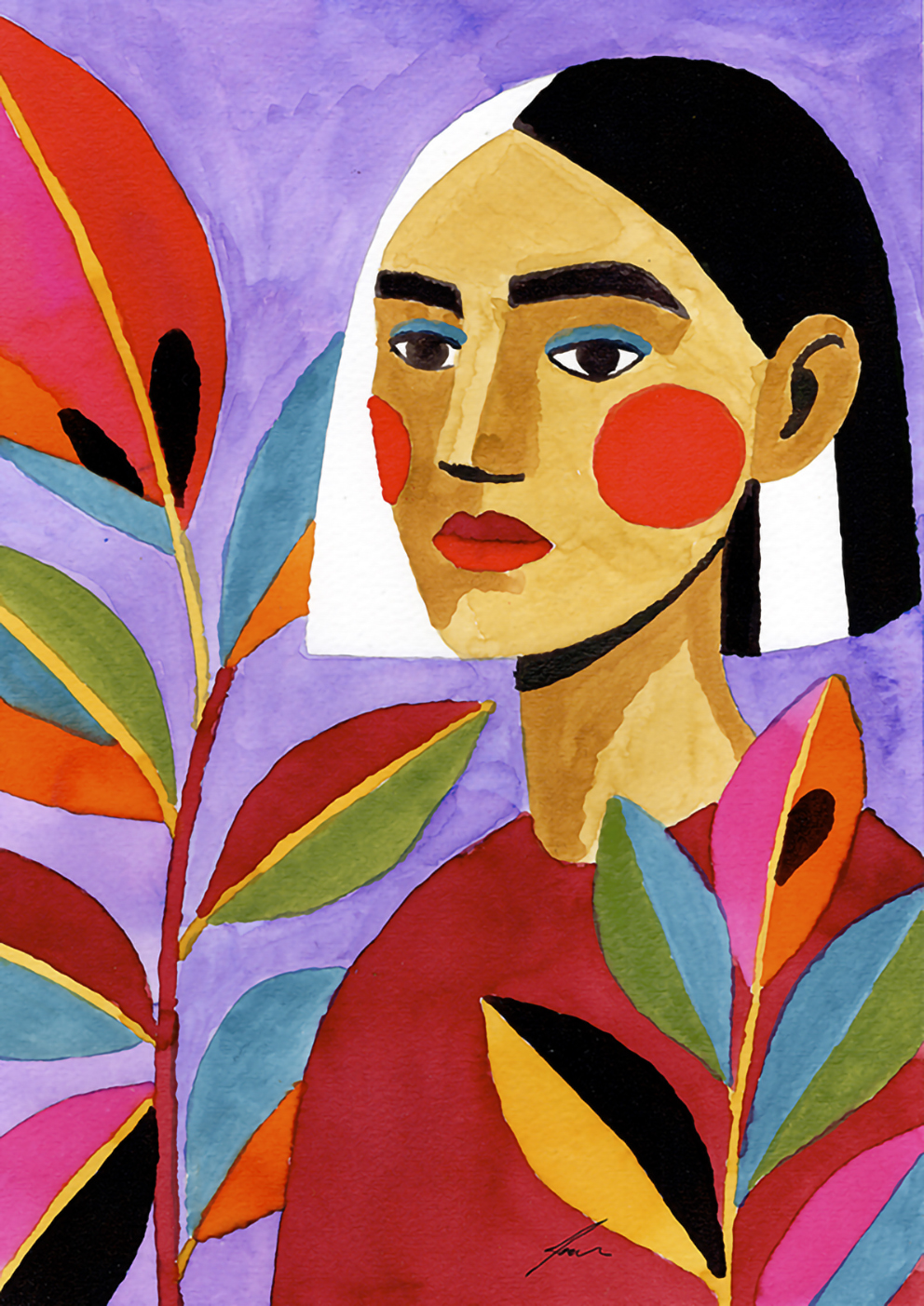 • Pintura a aguarela colorida de mulher com folhas largas coloridas ao redor em fundo roxo