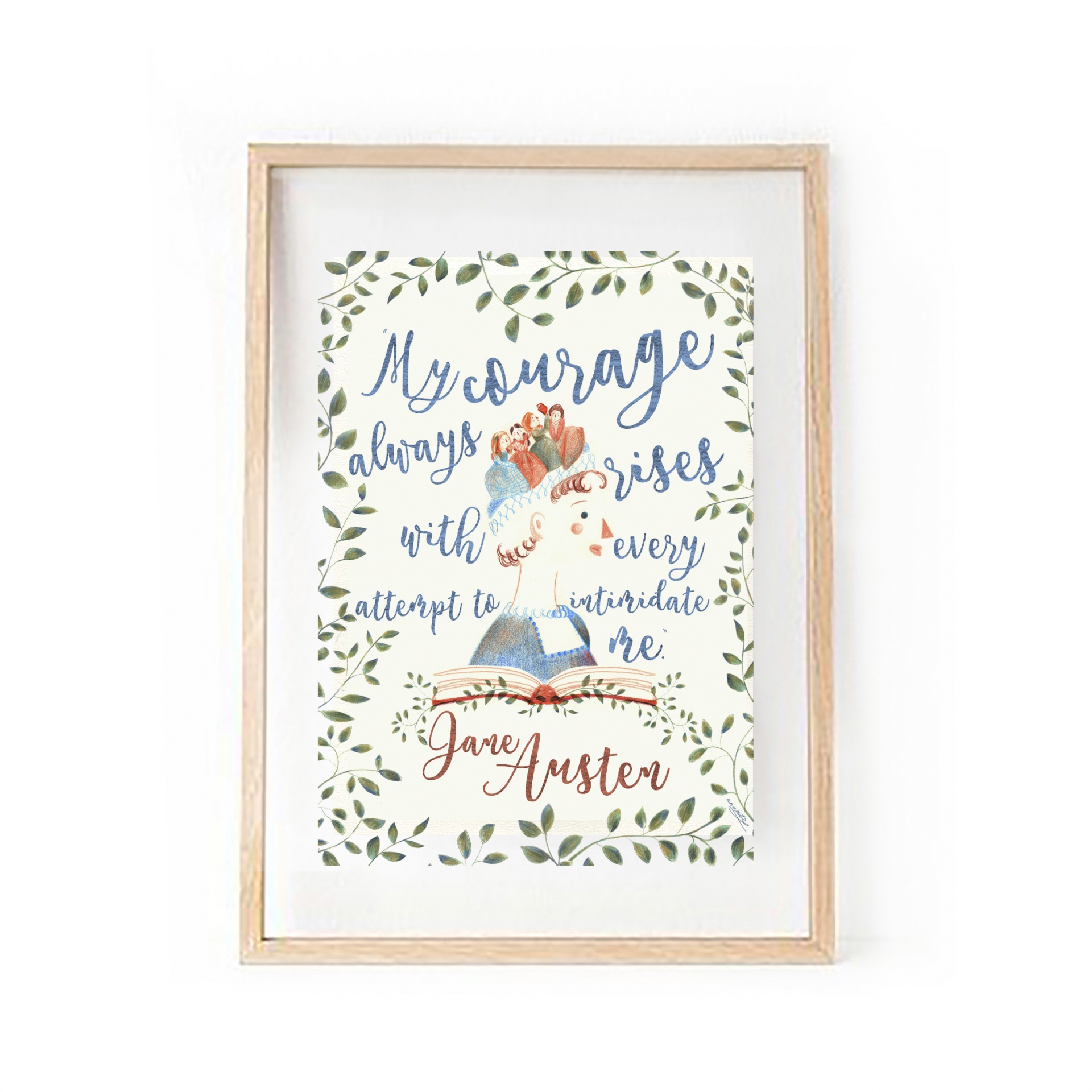 • Pôster artístico com moldura de madeira e texto de Jane Austen com ilustração de mulher e folhas verdes