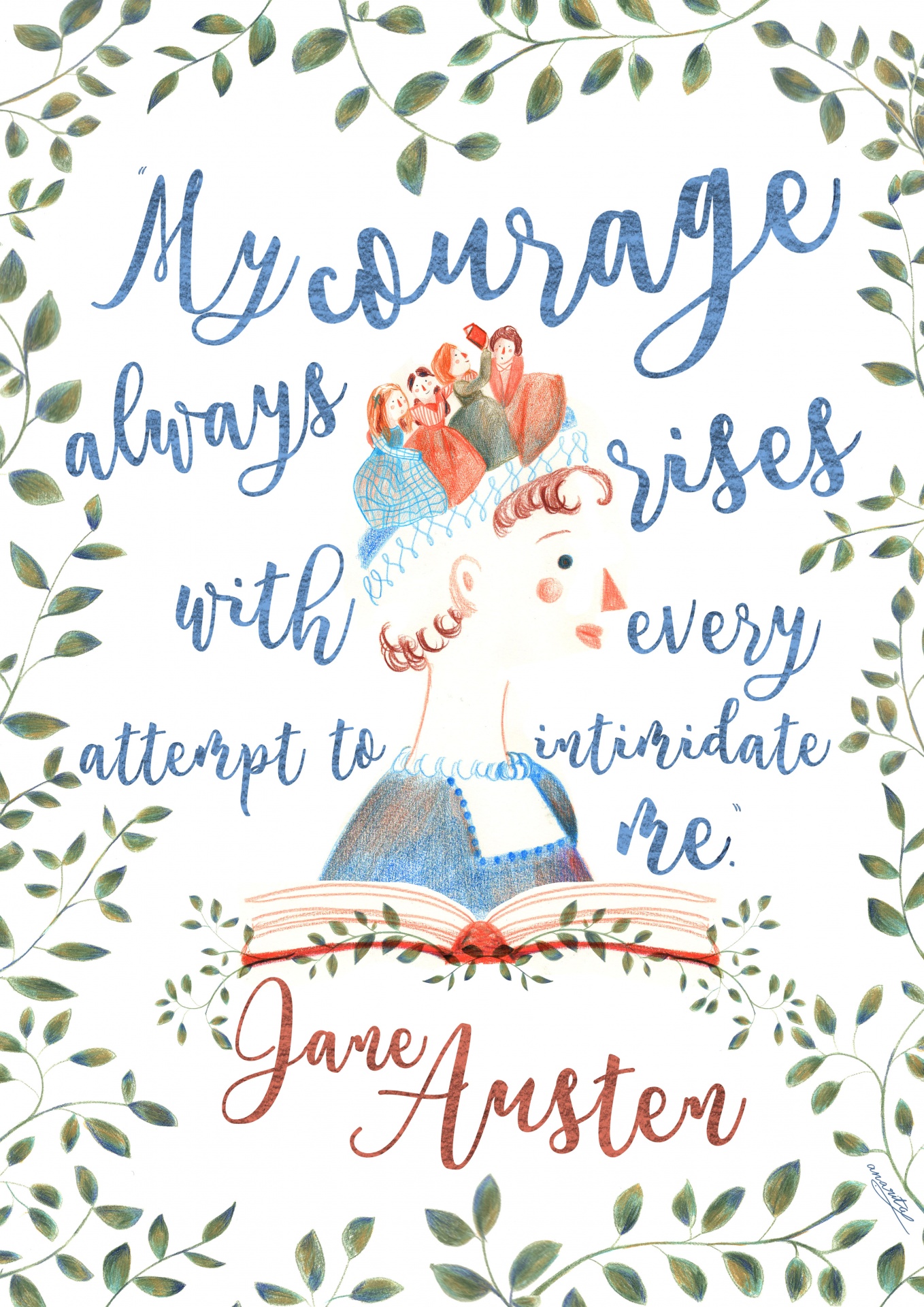 • Ilustração com citação de Jane Austen em letra artística e desenho de personagem com livro e folhas verdes ao redor