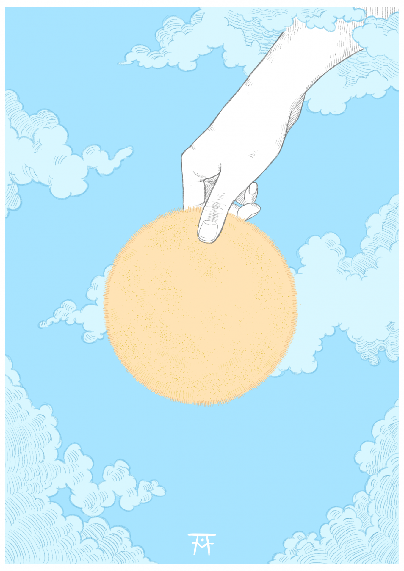 Ilustração de mão segurando disco amarelo no céu com nuvens