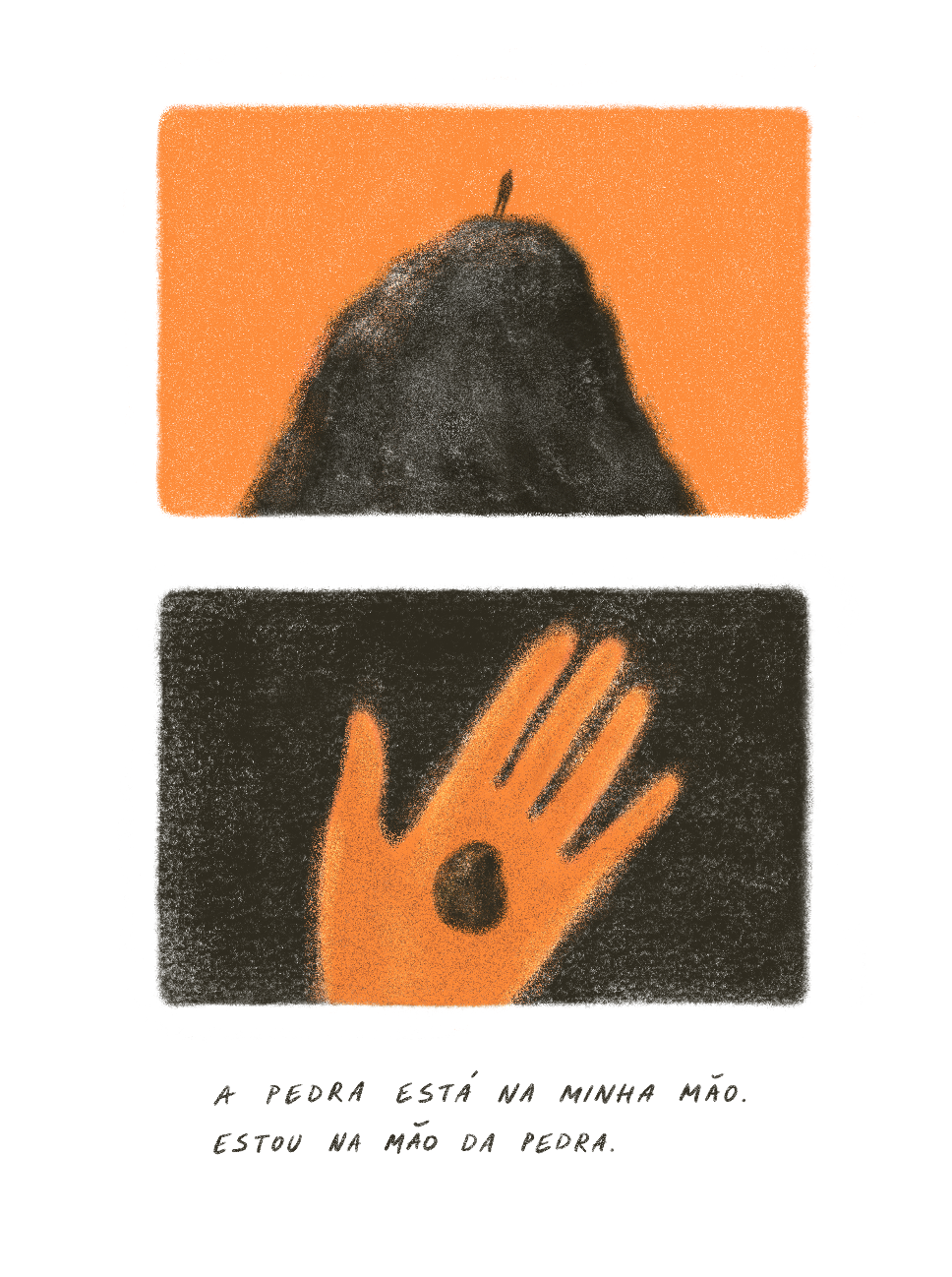 Desenho de uma pedra preta sobre fundo laranja e uma mão segurando a pedra com texto em português