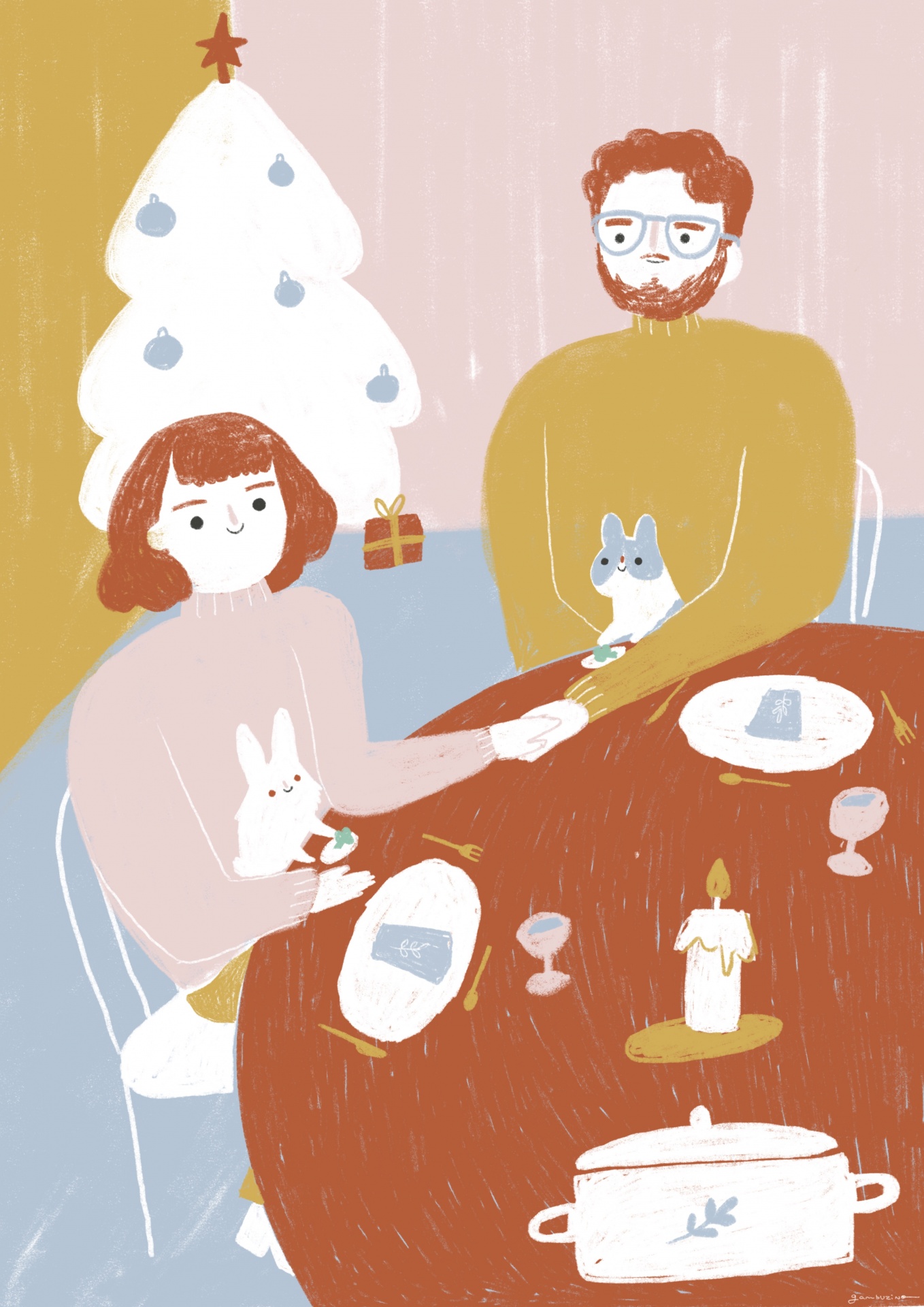 • Ilustração de duas pessoas sentadas à mesa com coelhos de peluche, árvore de Natal branca e mesa com alimentos e vela acesa
