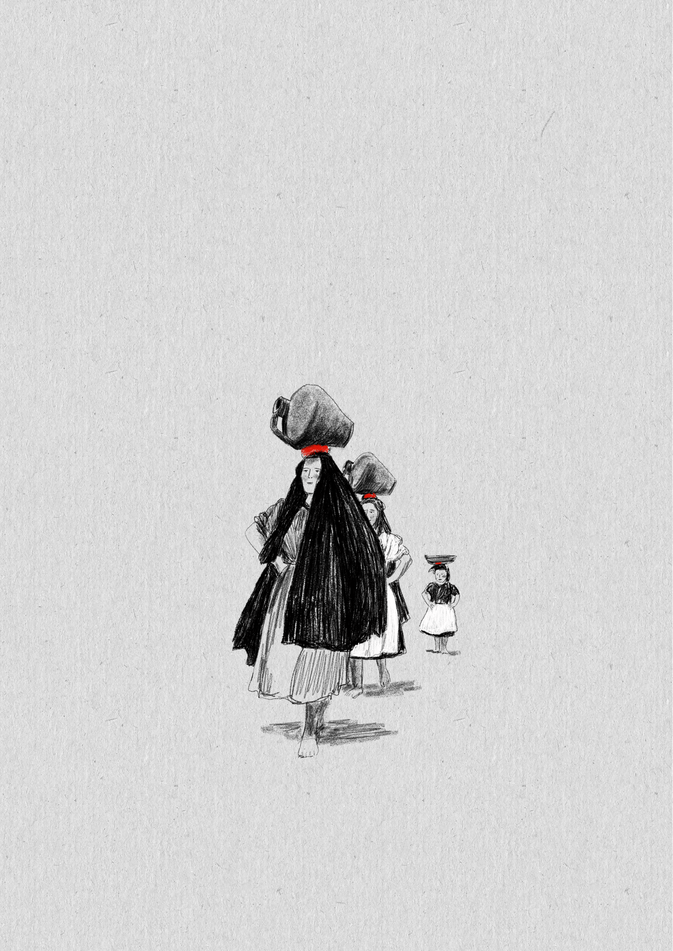 • Desenho preto e branco de três mulheres com objectos na cabeça e laços vermelhos no cabelo.