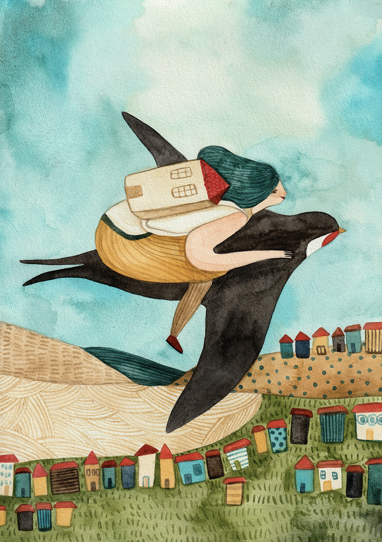 Mulher a voar numa ave preta gigante com casa às costas sobre aldeia colorida