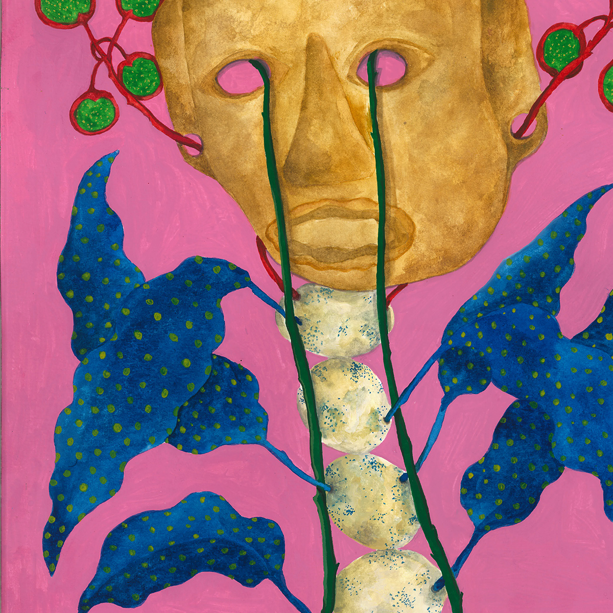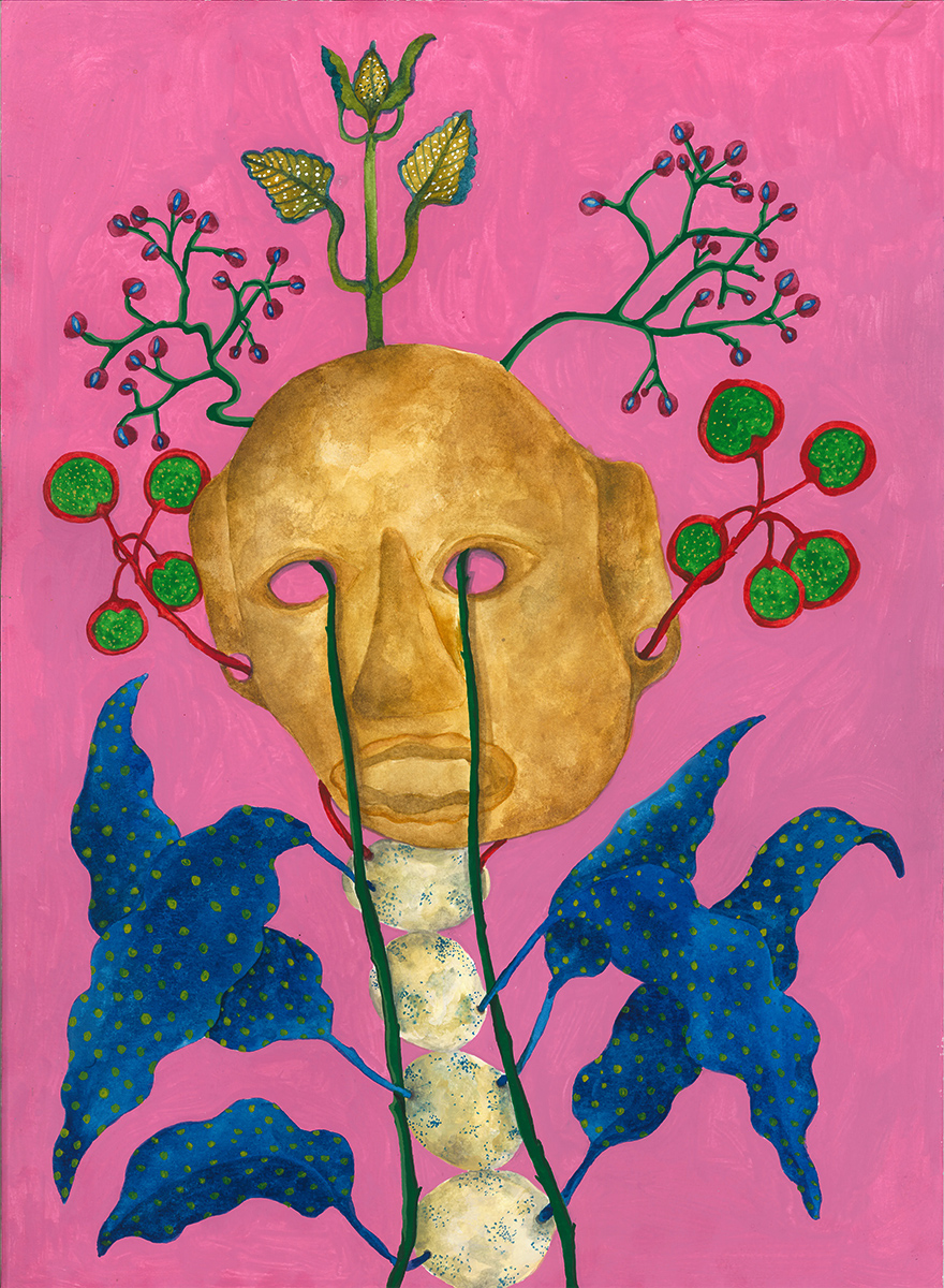 • Pintura com máscara dourada e plantas azuis sobre fundo rosa