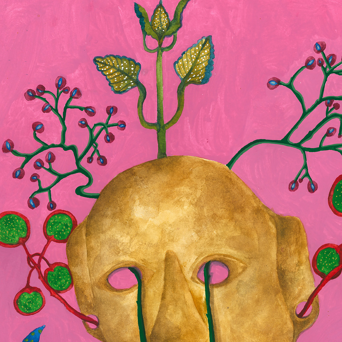 • máscara dourada envelhecida com folhas verdes crescendo e fundo rosa com ramificações coloridas
