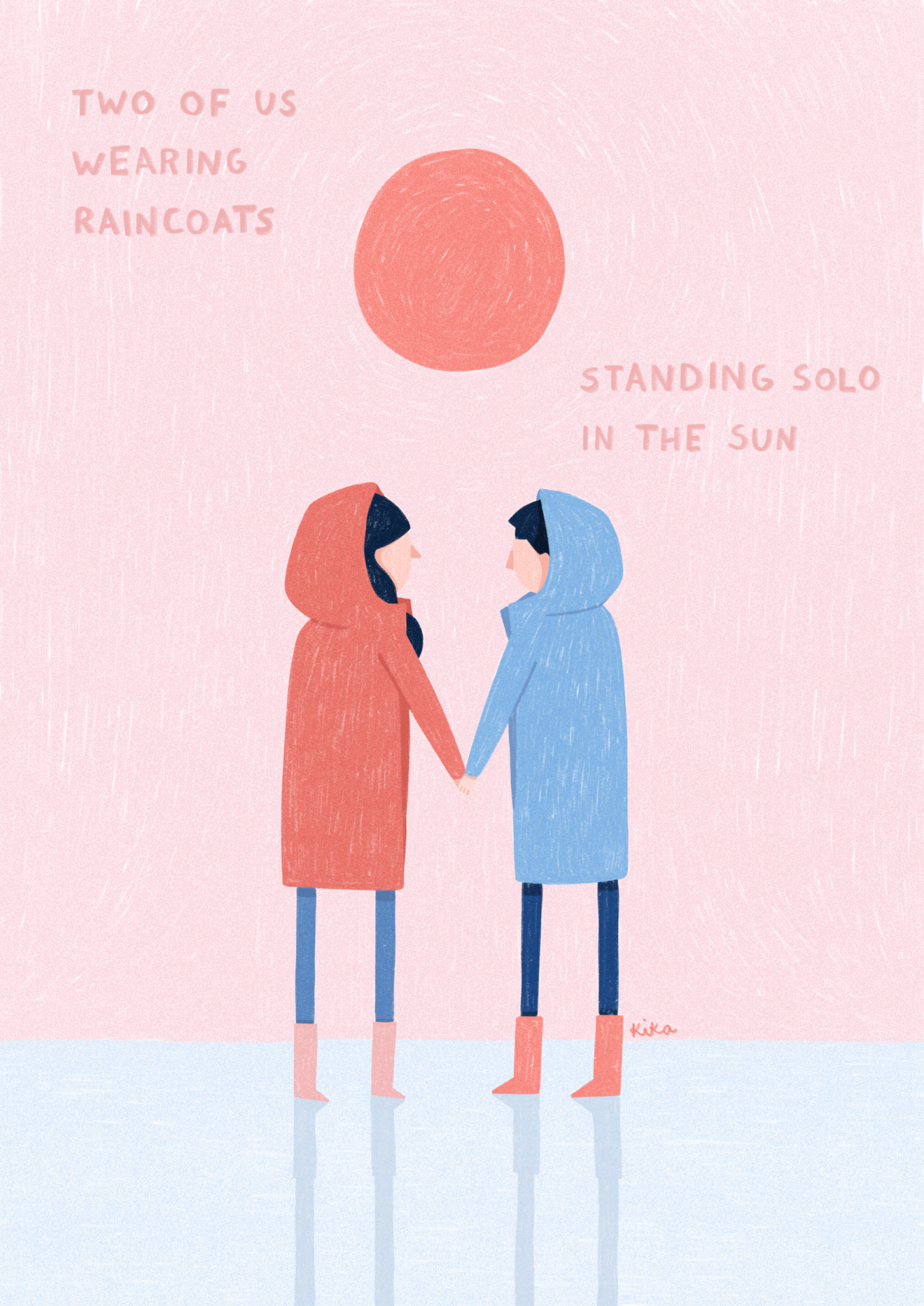 "Two of us" The Beatles "Two of us wearing raincoats; Standing solo in the sun, You and me chasing paper; Getting nowhere on our way back home; We're on our way home; We're on our way home; We're going home; We're going home; Better believe it; Goodbye"