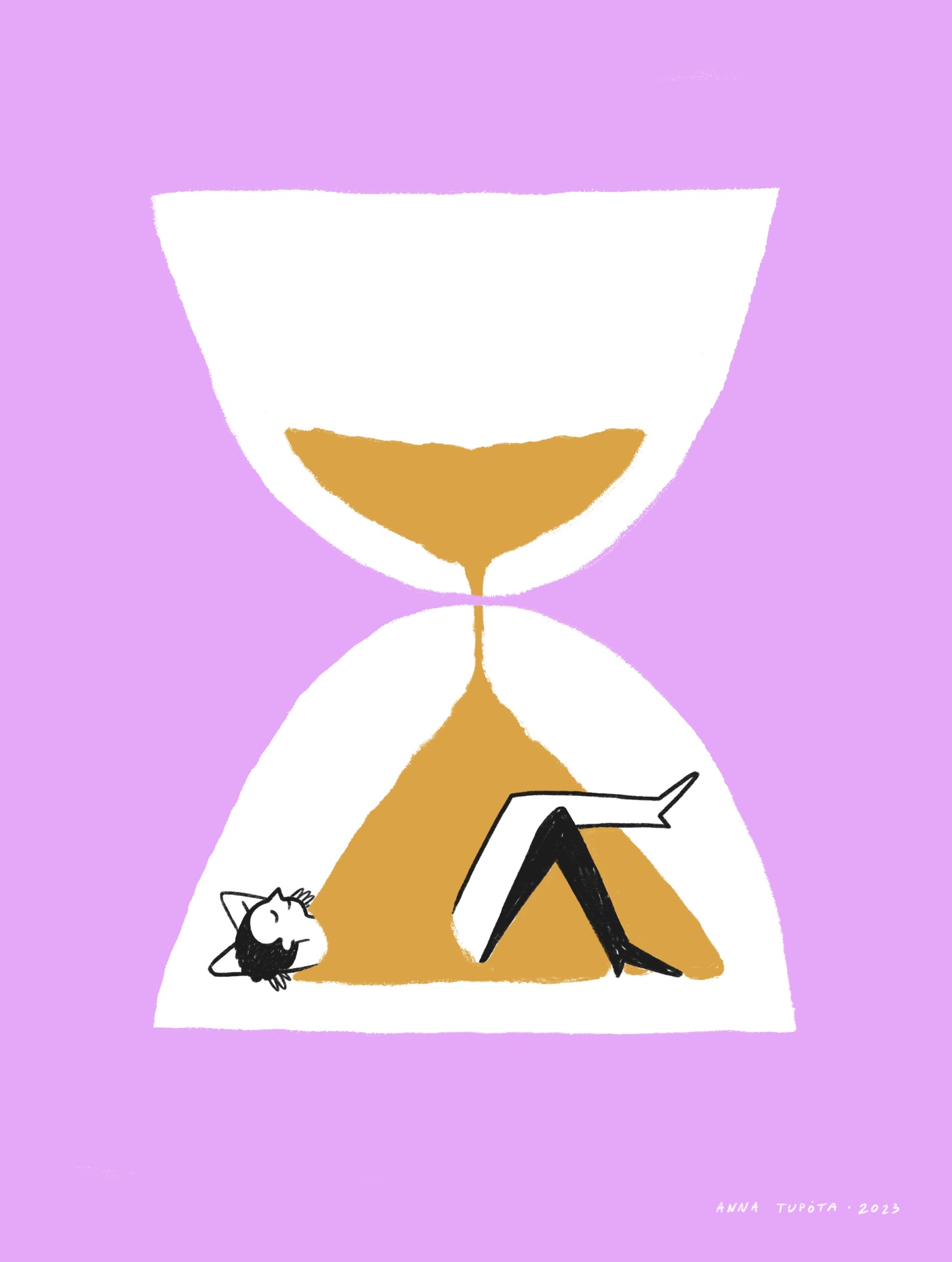• Desenho estilizado de uma ampulheta com areia castanha e figura humana dentro, em fundo lilás