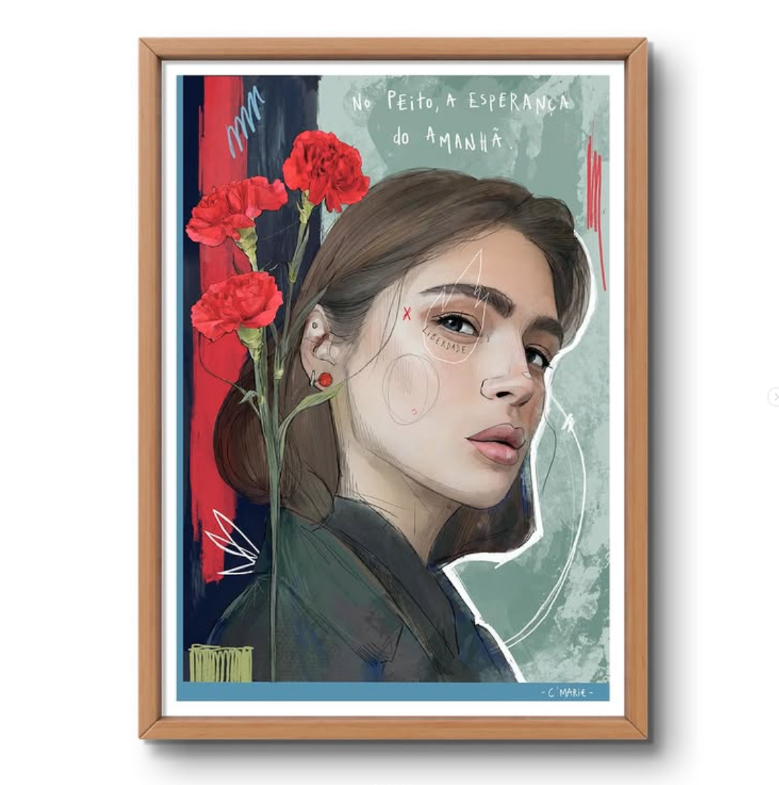 Pintura digital de mulher com cravos vermelhos e texto manuscrito