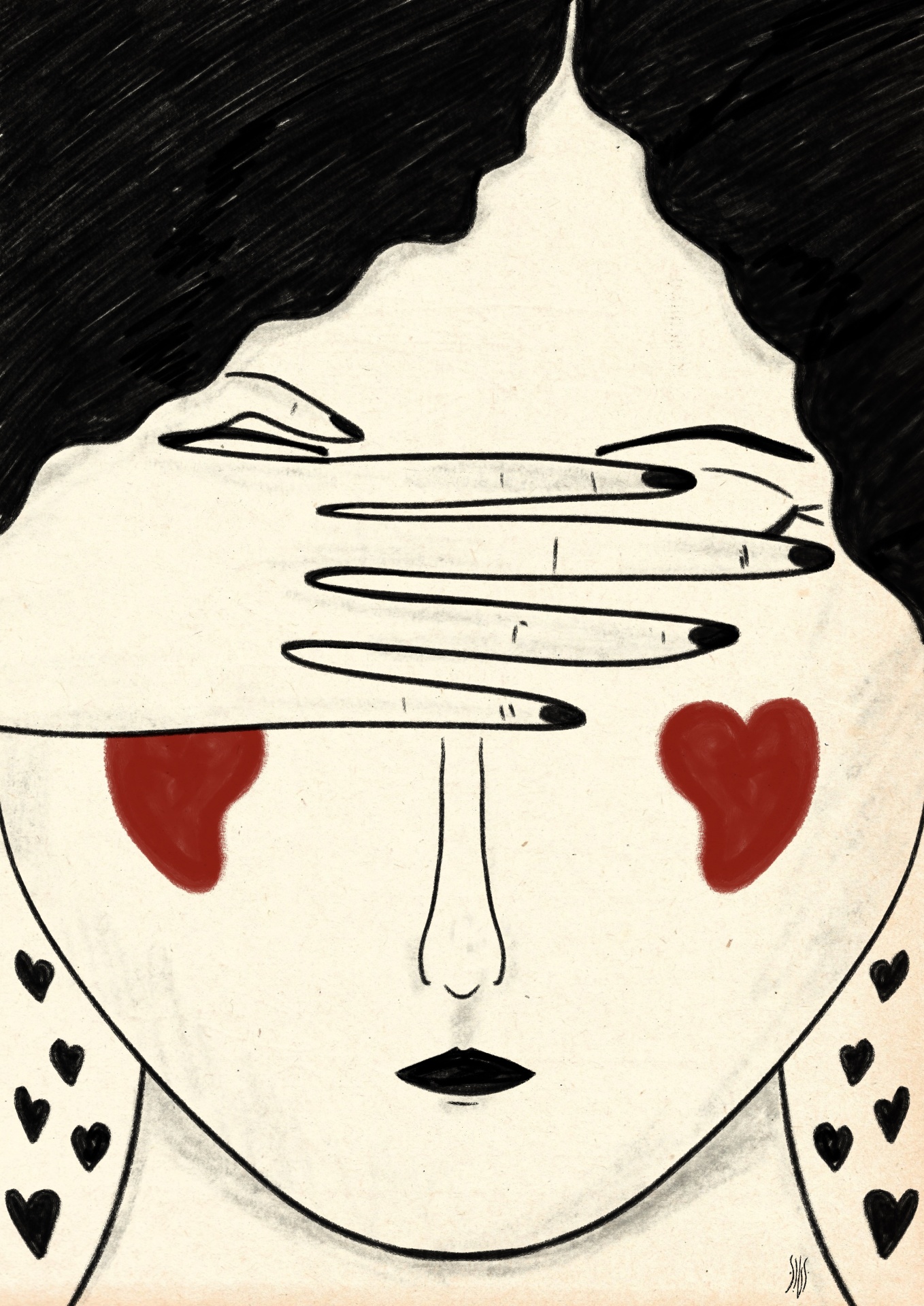 Desenho de rosto feminino com mãos a tapar os olhos e corações vermelhos nas bochechas