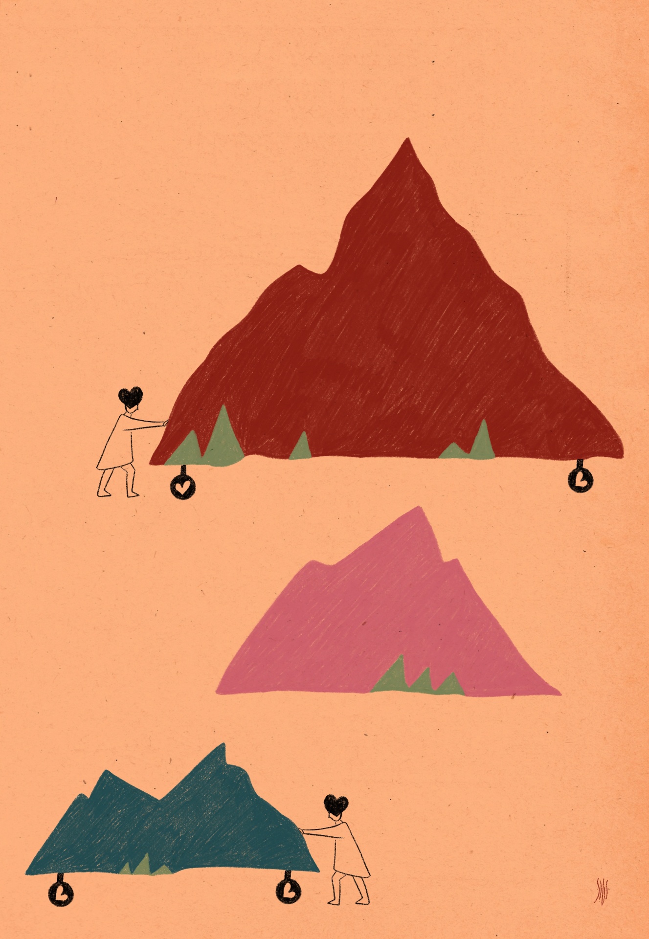 Ilustração colorida de montanhas com pessoas a empurrá-las sobre rodas