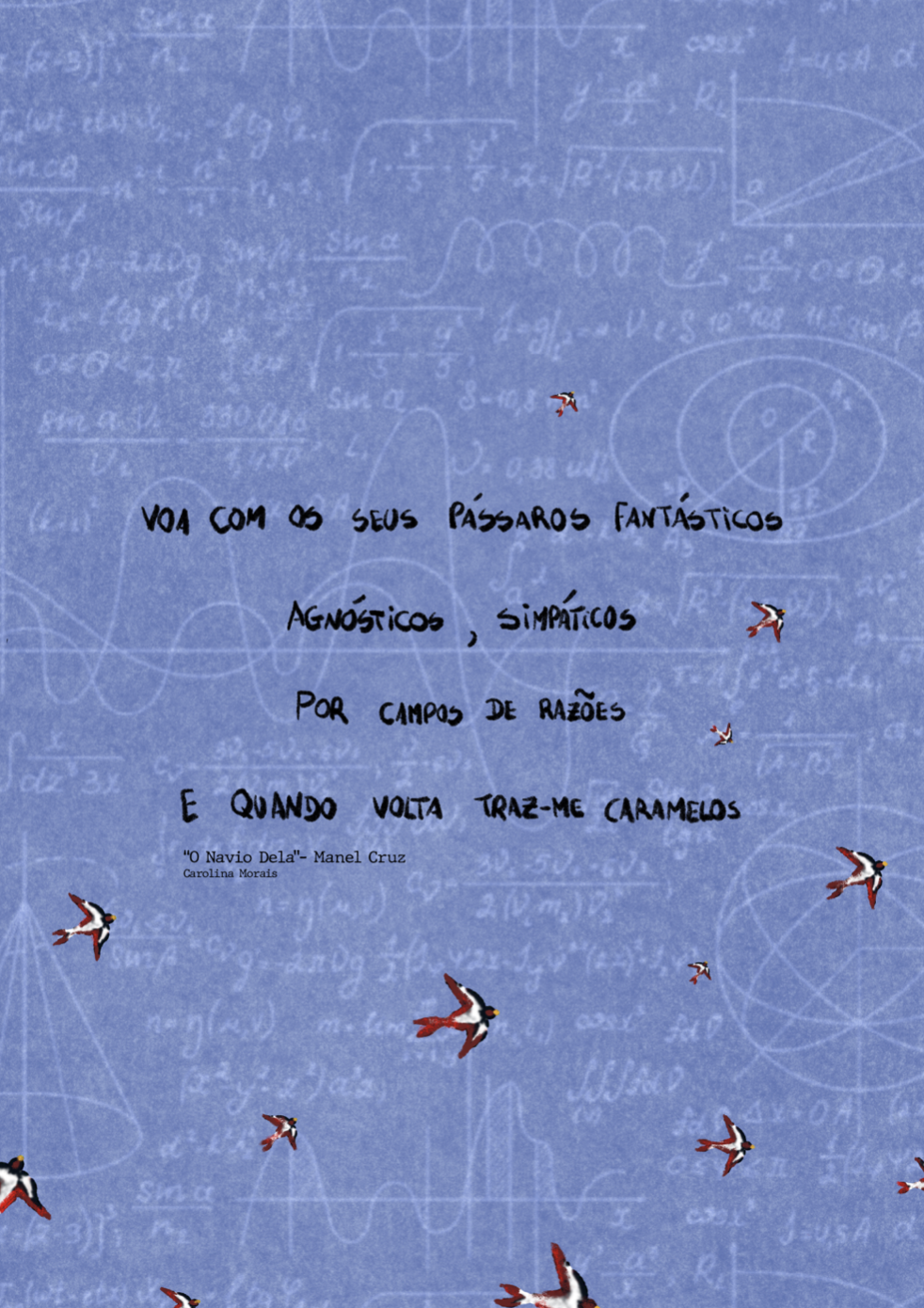 • Fundo azul com fórmulas matemáticas brancas, texto manuscrito preto e desenhos de pássaros vermelhos e brancos