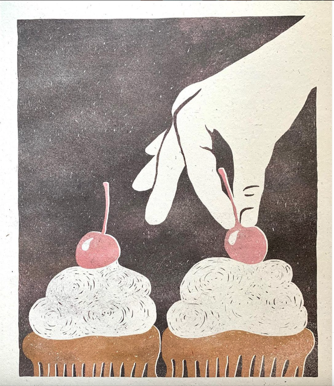 • Ilustração de duas bolos com cobertura branca e cerejas, mão a mexer na cereja do bolo direito