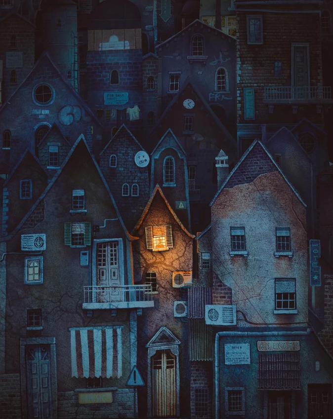 Ilustração de casas antigas em tons escuros com uma janela iluminada