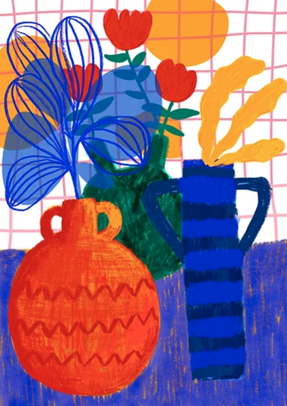 • Desenho de três vasos coloridos com flores e folhas em fundo geométrico.