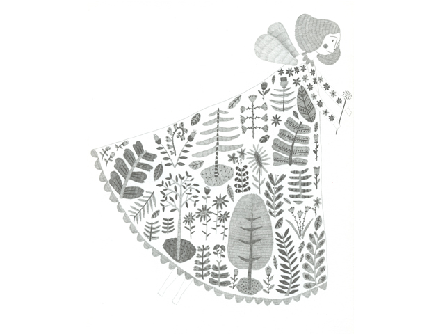 • Ilustração a preto e branco de figura feminina com vestido estampado de folhas e asas pequenas