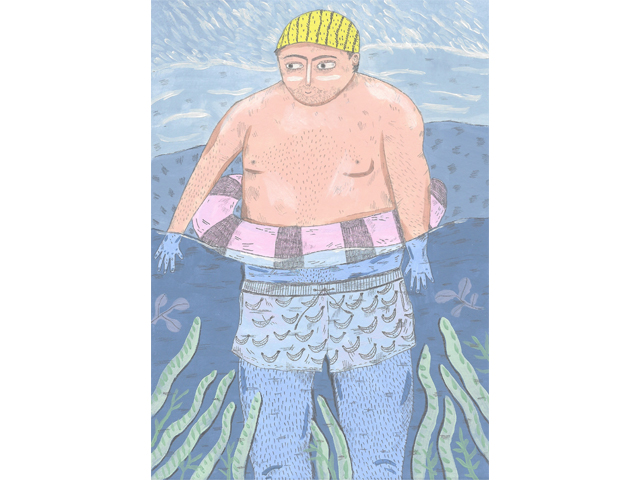 Ilustração de uma pessoa em água com touca amarela e bóia rosa