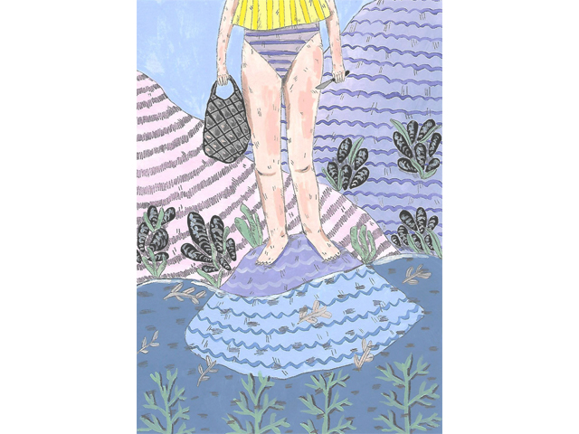 Ilustração de pessoa com camiseta amarela, cuecas às riscas azul e branca, e bolsa preta num fundo colorido com plantas