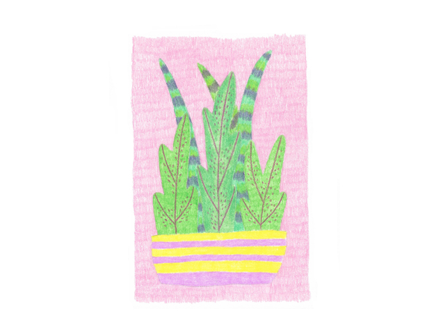 • Ilustração em aquarela de planta suculenta verde num vaso laranja com riscas amarelas