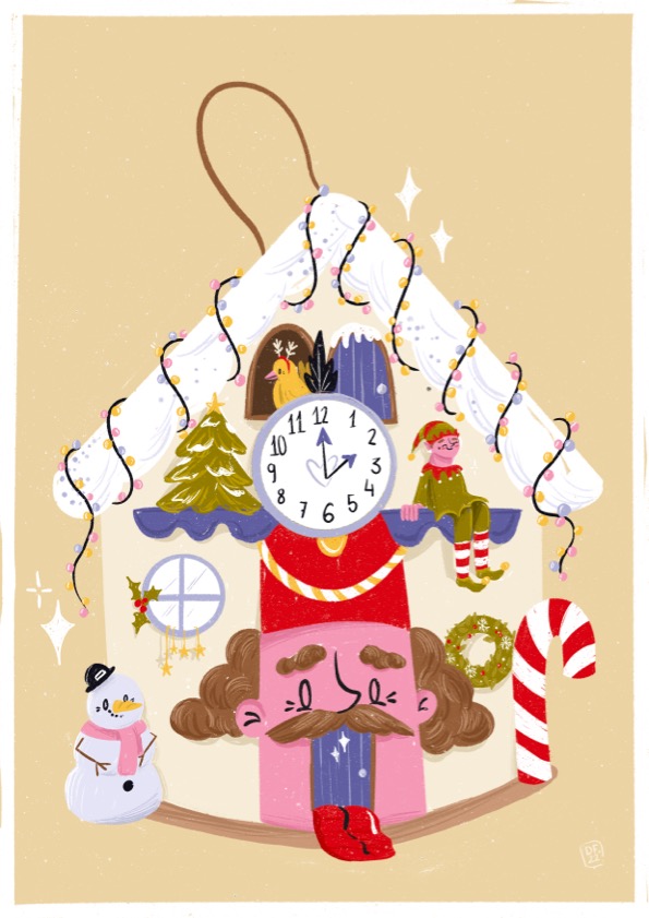 • Casa de relógio decorativa natalícia com neve, luzes e personagens como boneco de neve e duende.