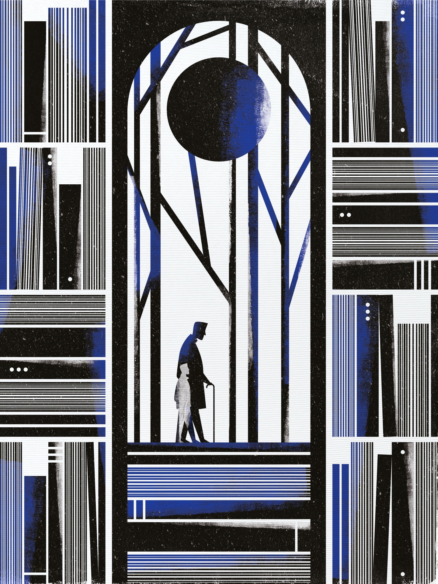 Ilustração abstrata com janela arqueada, barras pretas e esfera azul, duas figuras humanas caminhando.