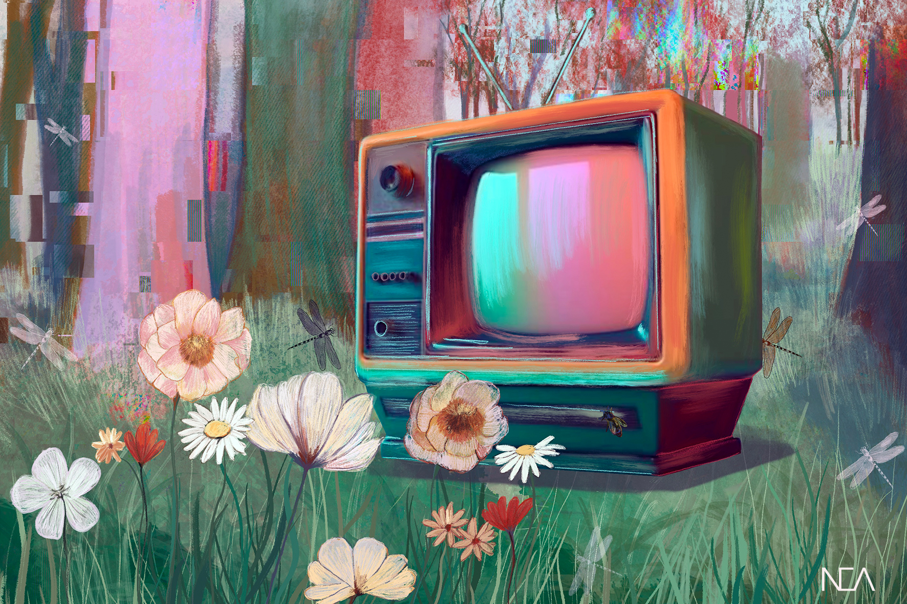 • Televisor vintage com moldura laranja e verde numa campina florida