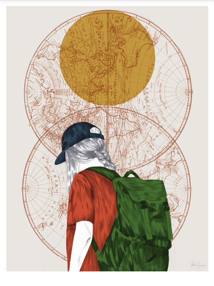 • Pessoa com mochila verde e boné atrás de mapas circulares antigos e círculo amarelo.