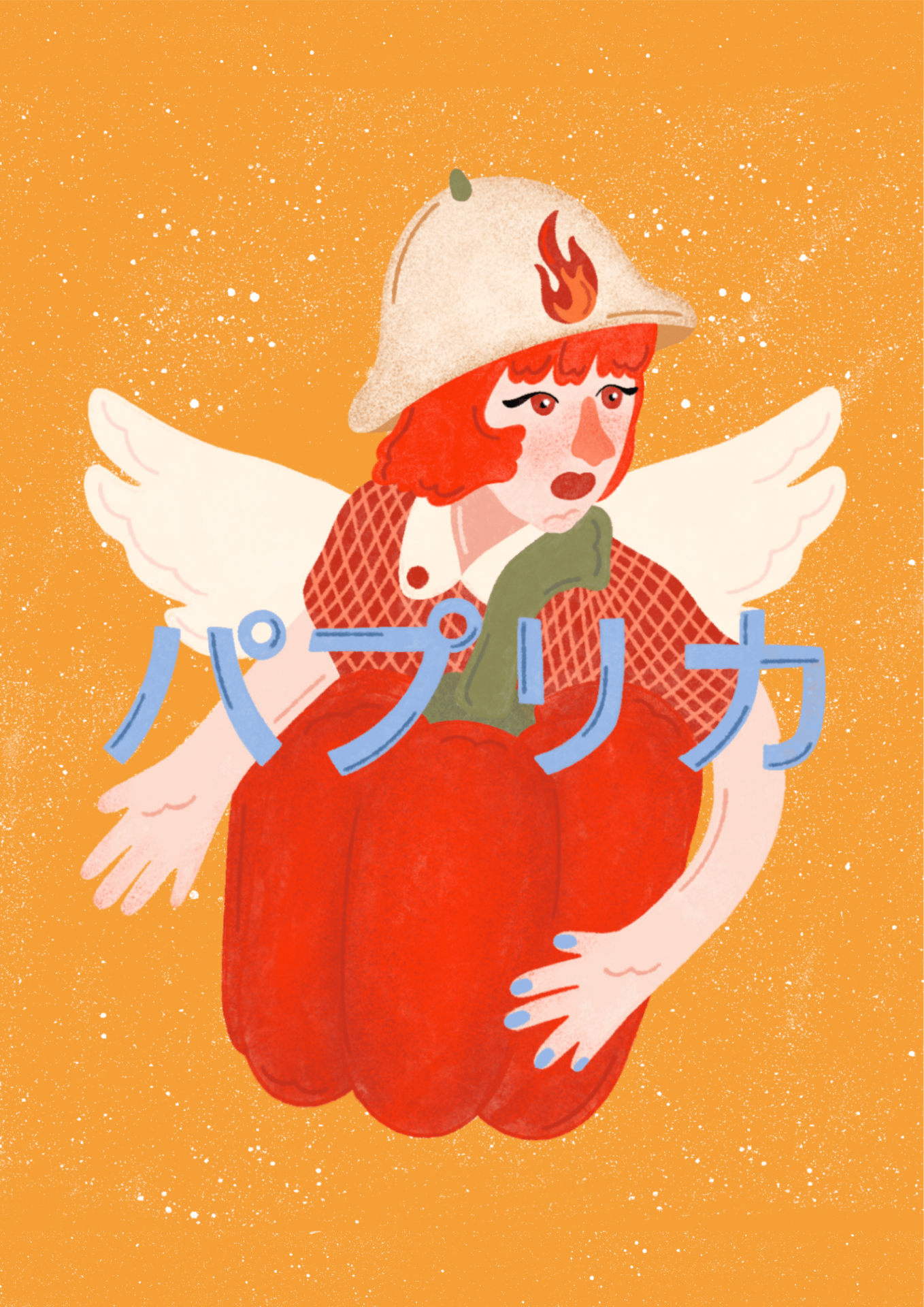 • Ilustração de figura com asas e pimento vermelho segurado, com capacete e fundo laranja texturizado.