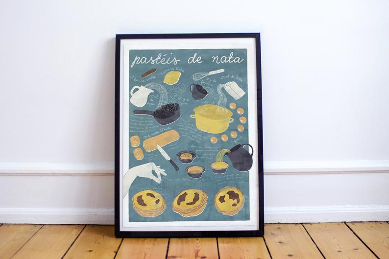 • Cartaz ilustrativo colorido com utensílios de cozinha e pastéis de nata emoldurado apoiado no chão.
