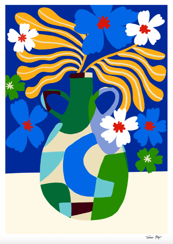 • Vaso decorativo colorido com flores estilizadas em fundo azul.