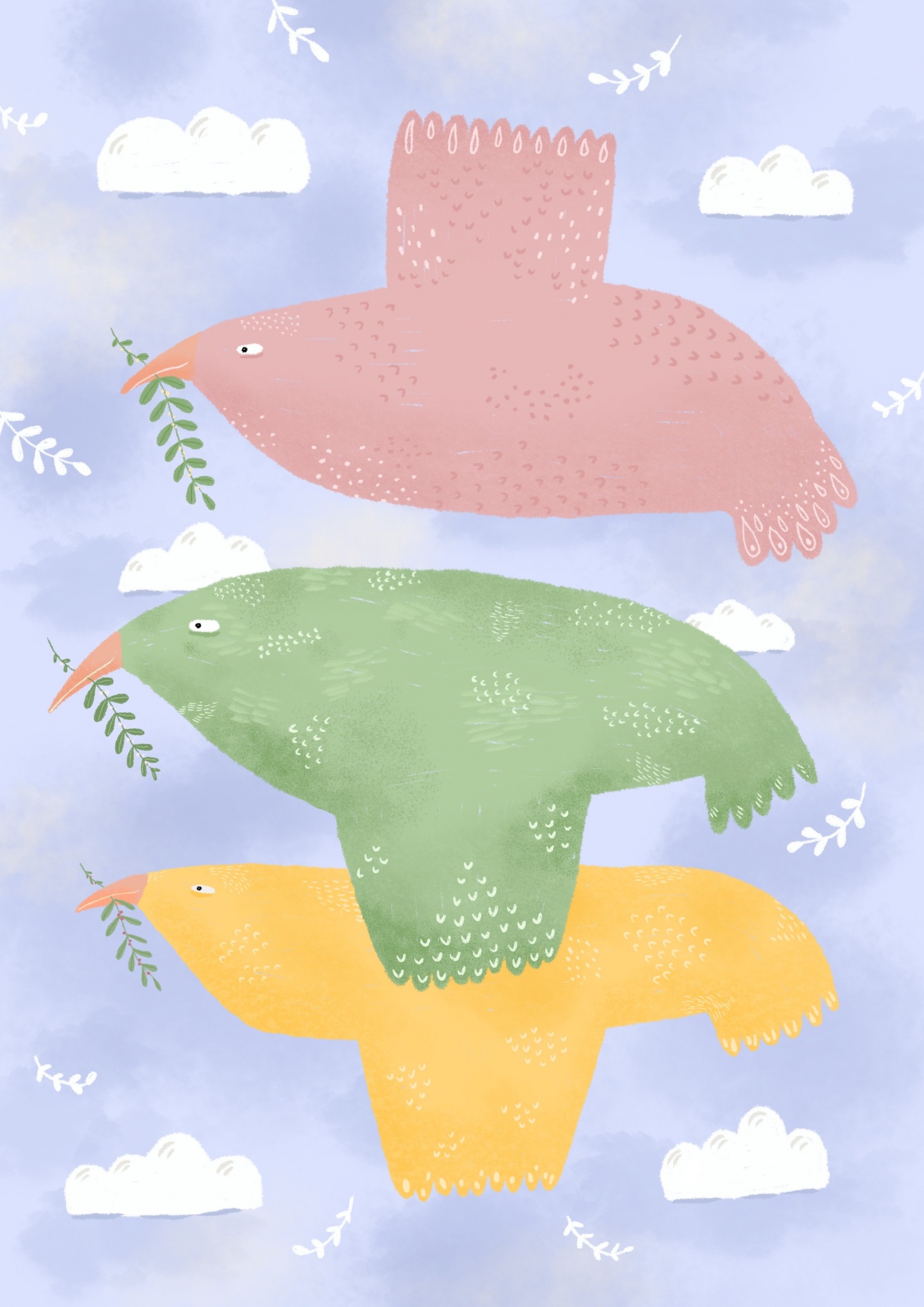 Ilustração de três pássaros coloridos voando segurando ramos em fundo azul
