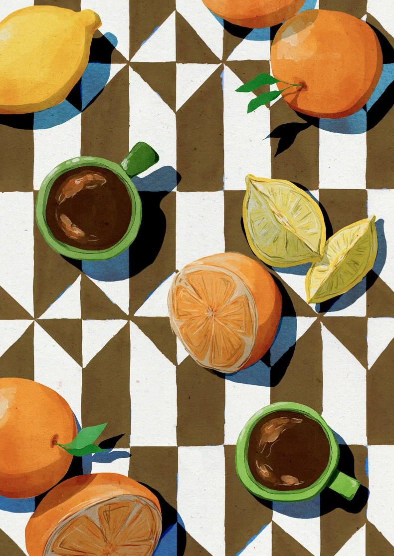 • Mesa geométrica com chávenas verdes, laranjas e limões