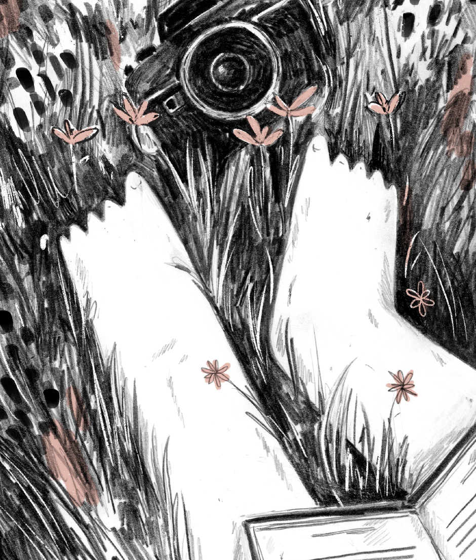 Desenho a preto e branco de pés descalços em relva com flores cor de rosa e uma câmara fotográfica