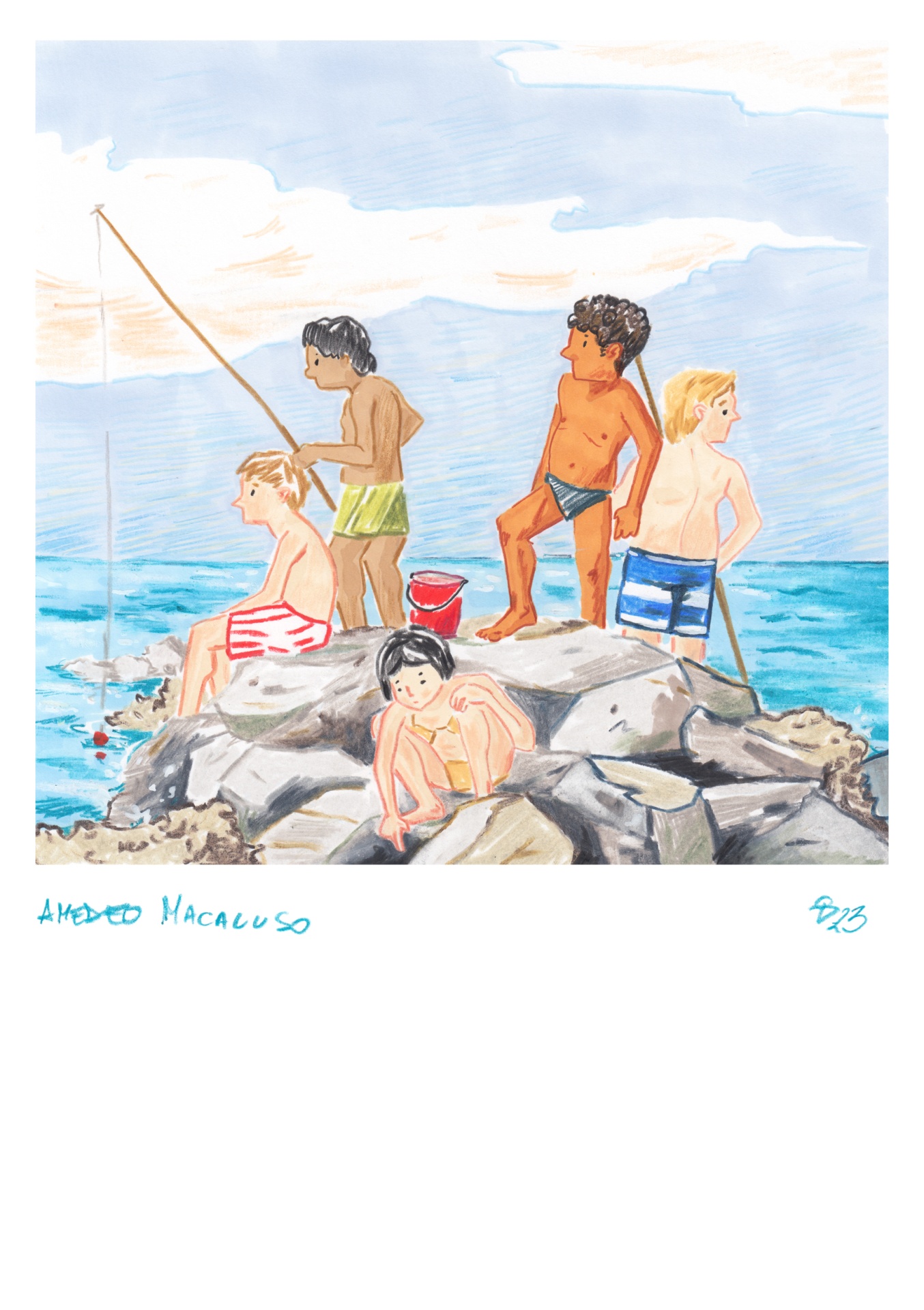 Nesta “polaroid” são representadas crianças brincando nas rochas e pescando. Ao criar esta imagem, a intenção era salvar a memória do que aconteceu diante dos meus olhos durante um dia na praia, ao longo de uma viagem à Toscana.