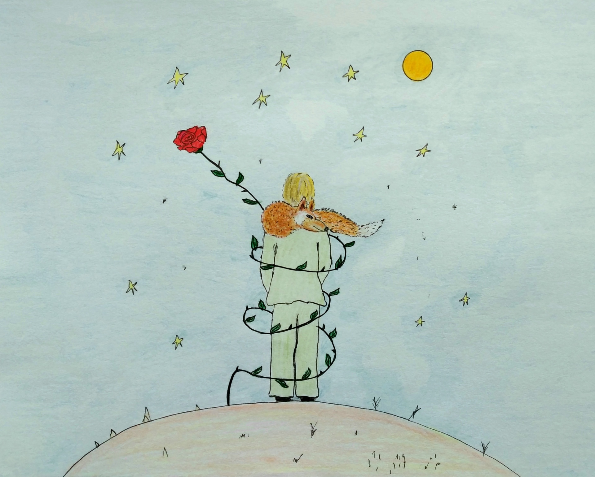 Desenho a cores de duas figuras humanas abraçadas com trepadeira e rosa vermelha, estrelas e sol num fundo azul claro