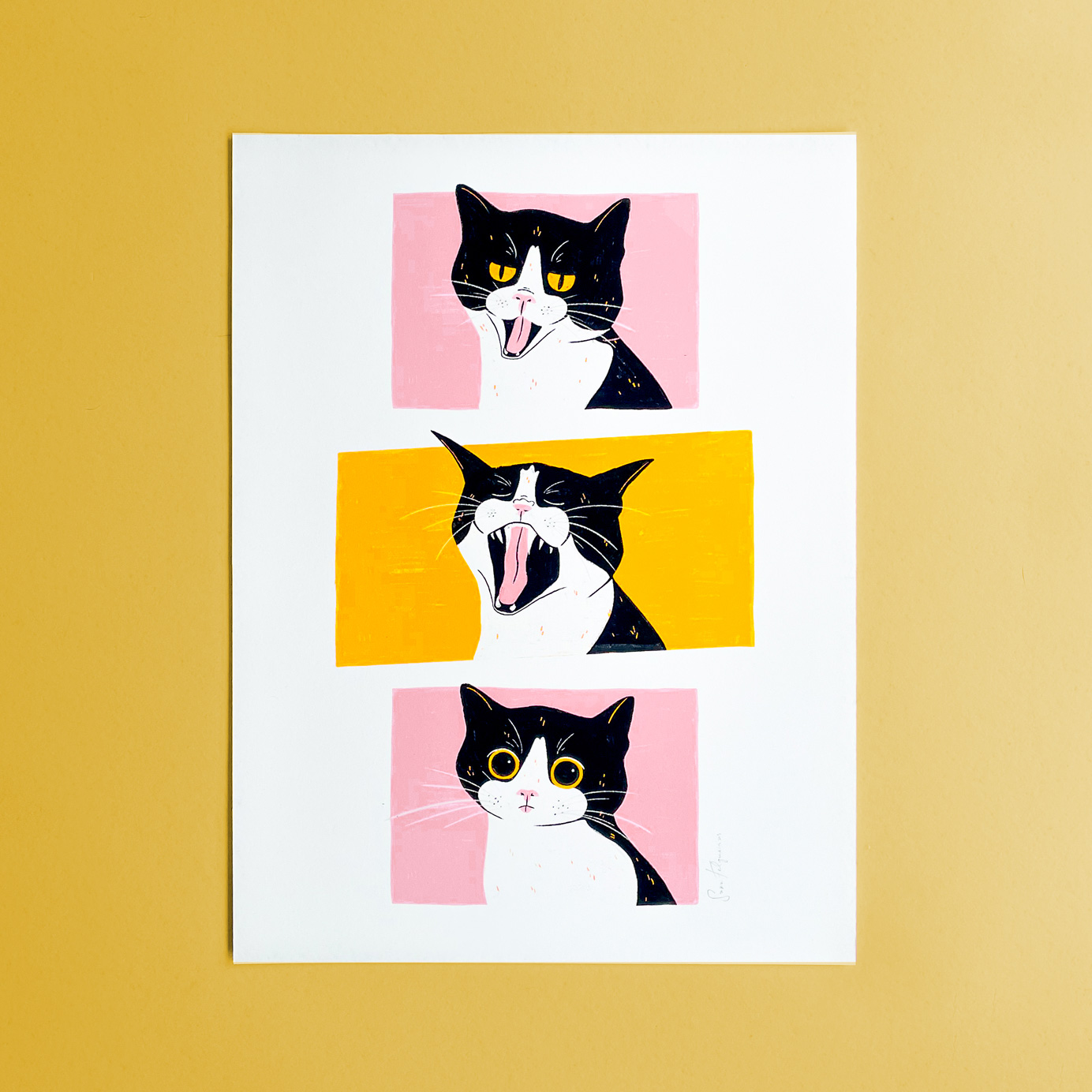 • Cartaz com três desenhos de um gato preto e branco em fundos coloridos rosados e amarelo.