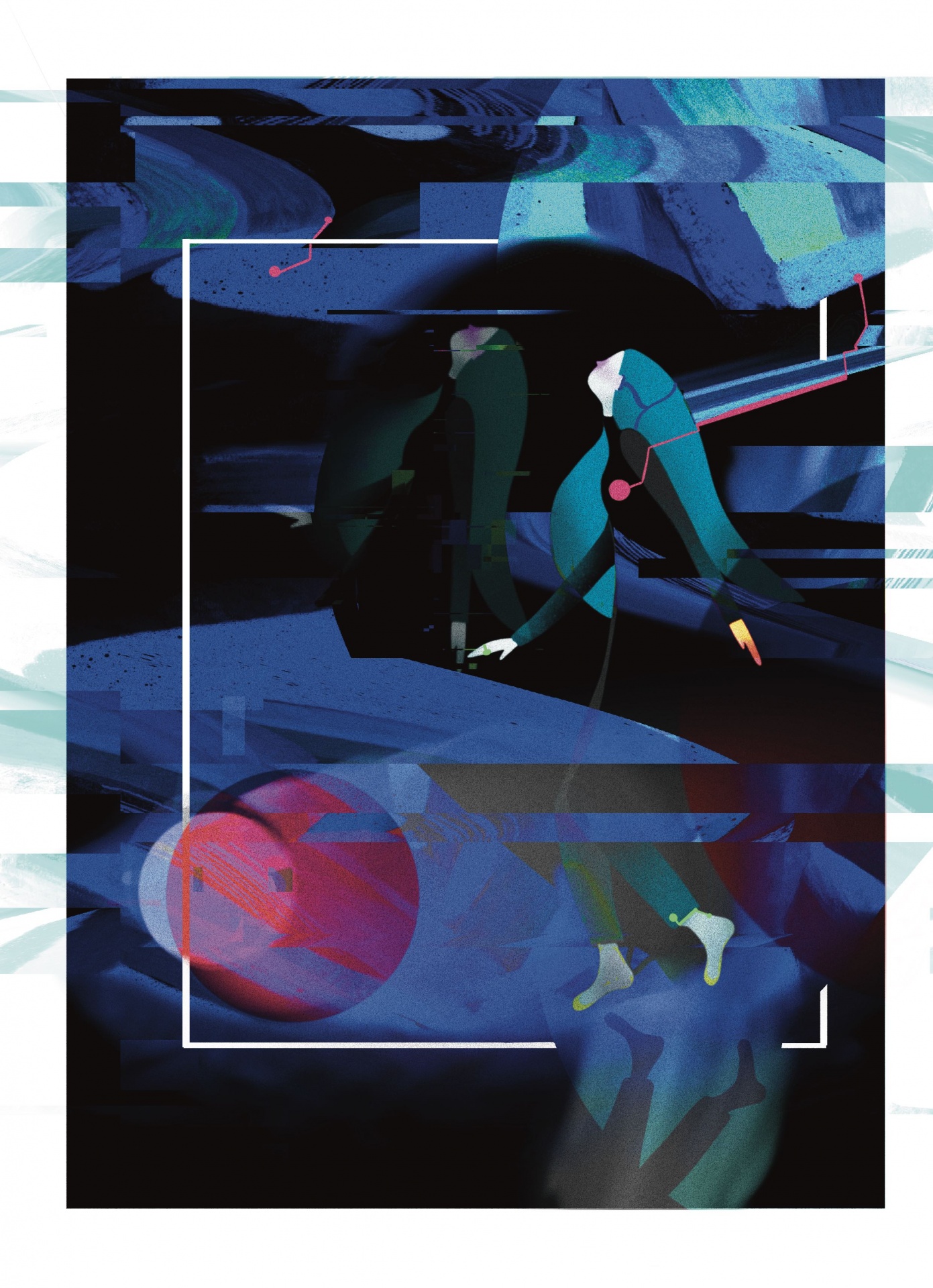 • Imagem digital abstrata com figuras humanas estilizadas e elementos geométricos