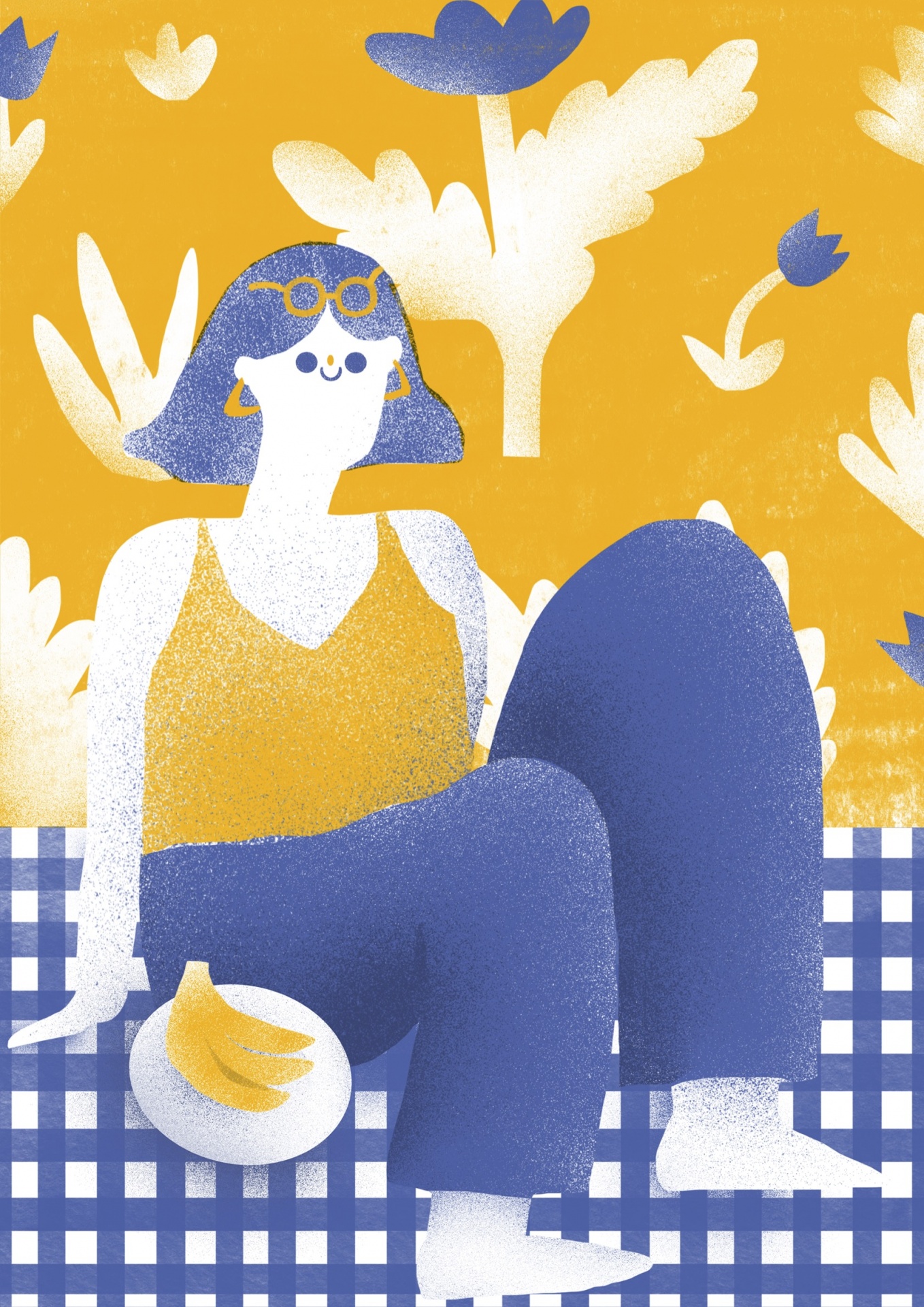 • Ilustração personagem sentada em toalha xadrez com roupa amarela e azul segurando prato com banana.
