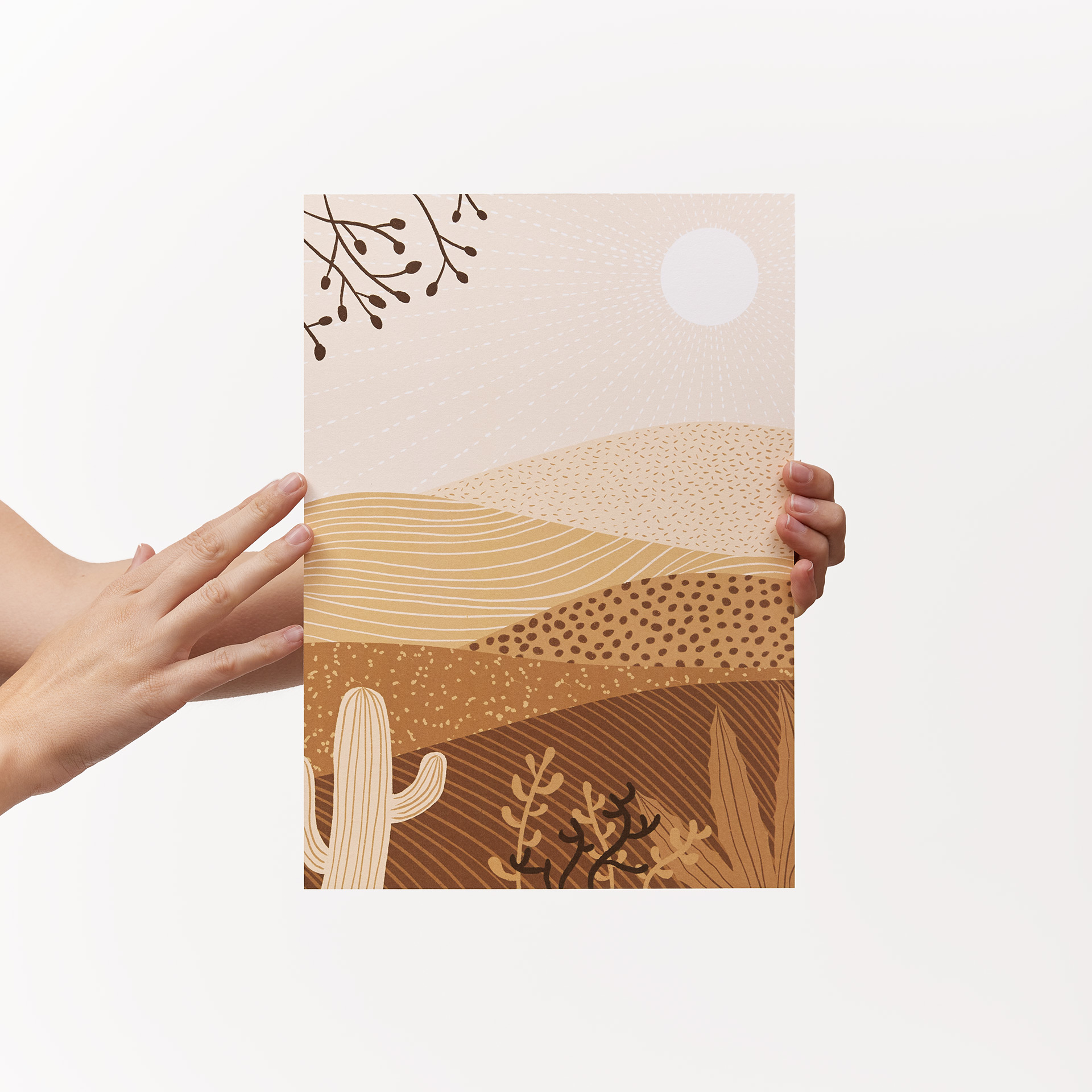 • Ilustração de cenário desértico em tons de bege e castanho com cactos e sol