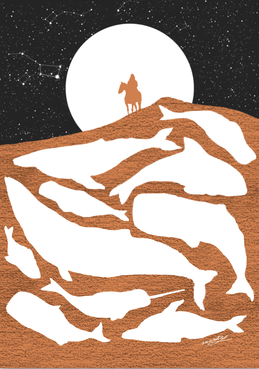 Imagem artística de várias formas brancas de peixes em solo castanho com lua cheia e figura a cavalo ao fundo