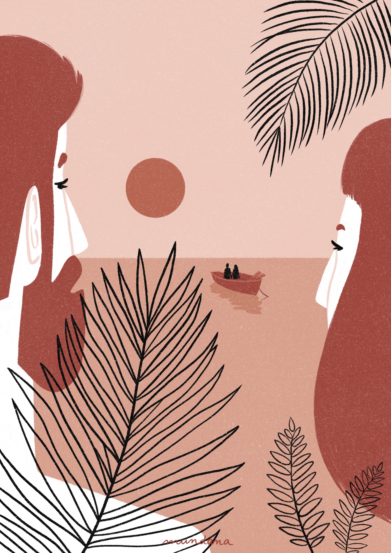 • Ilustração de duas pessoas de perfil frente ao mar com folhas pretas em primeiro plano e um barco ao fundo