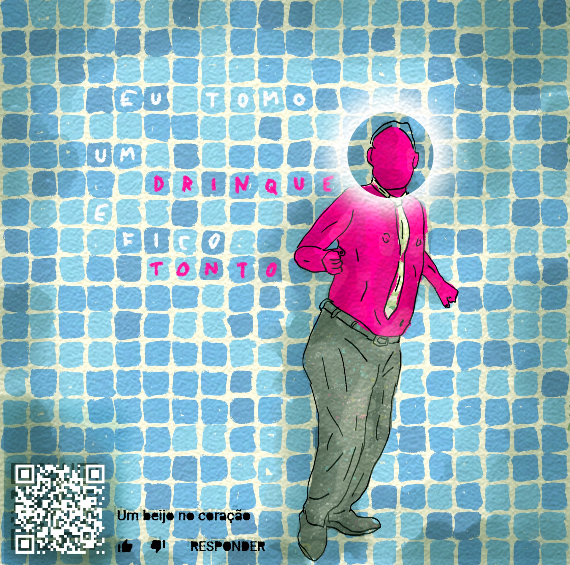 Figura humana rosa sobre azulejos azuis com texto e código QR