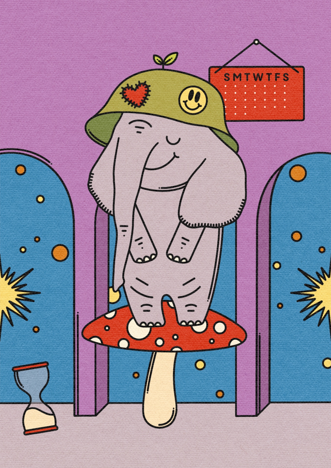 • Desenho de elefante com chapéu em cogumelo vermelho num cenário lilás com portas azuis e calendário