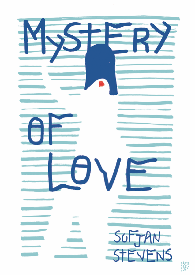 • capa de álbum com texto 'MYSTERY OF LOVE' e 'SUFJAN STEVENS' e silhueta humana azul