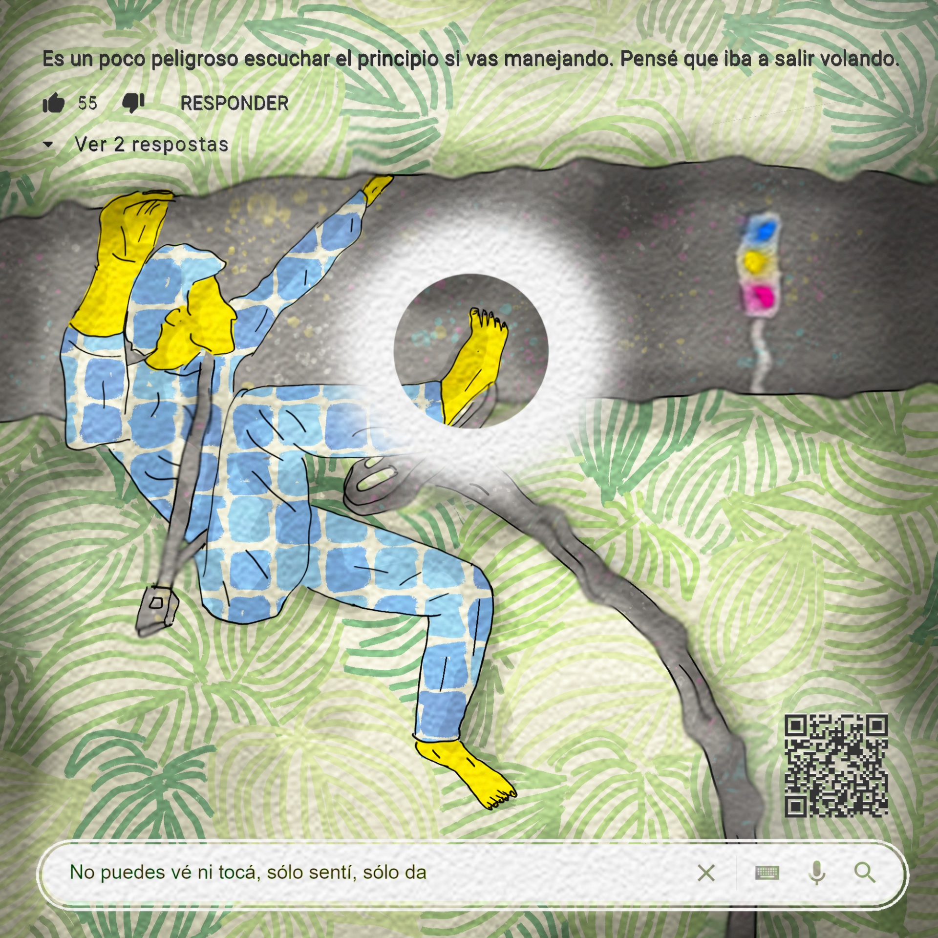 • Figura em pijama azul e branco a cair sobre fundo com padrão de folhas verdes, com texto e código QR